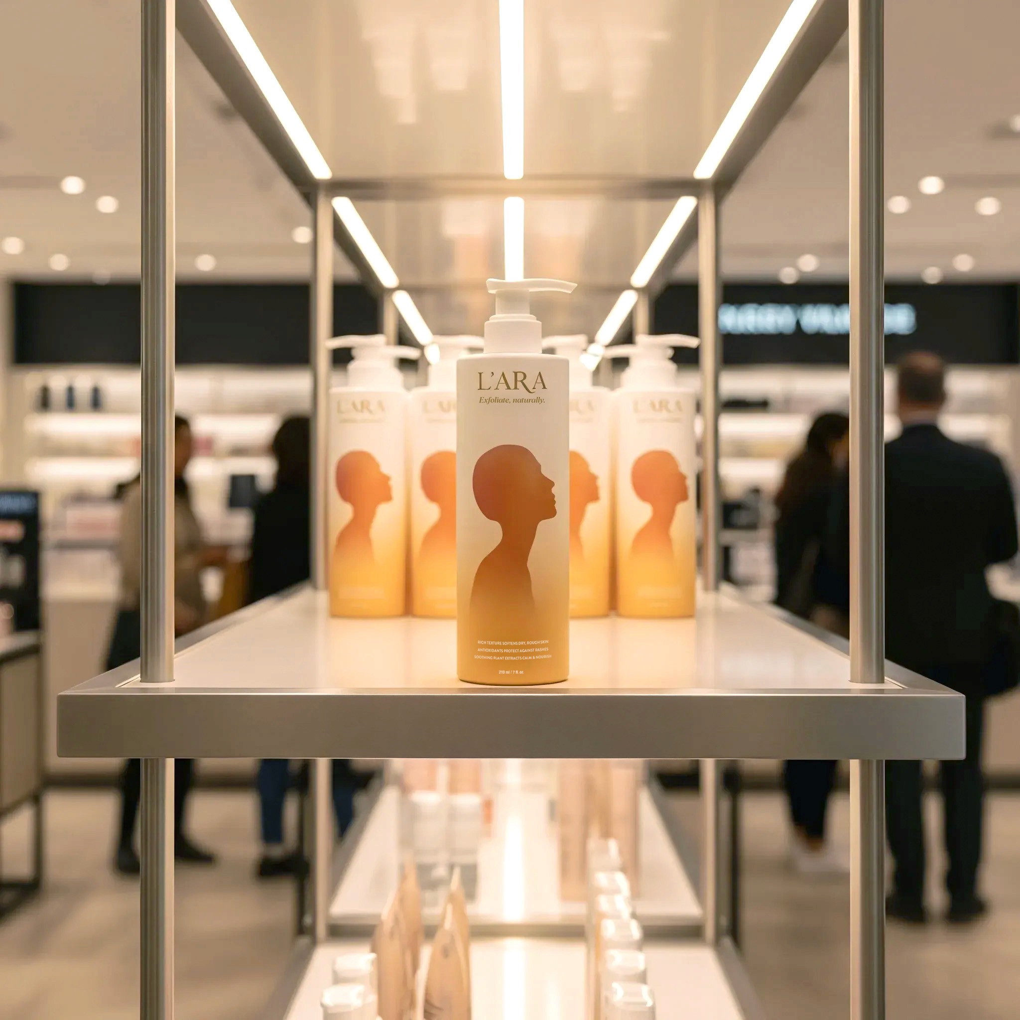L’ara needed a body lotion design that would stand out on shelf while remaining soft, inclusive, and premium. The challenge was to create a visual language that emphasizes skin over stereotypes, feels inviting to a broad audience, and communicates hydration and care without relying on typical beauty clichés.