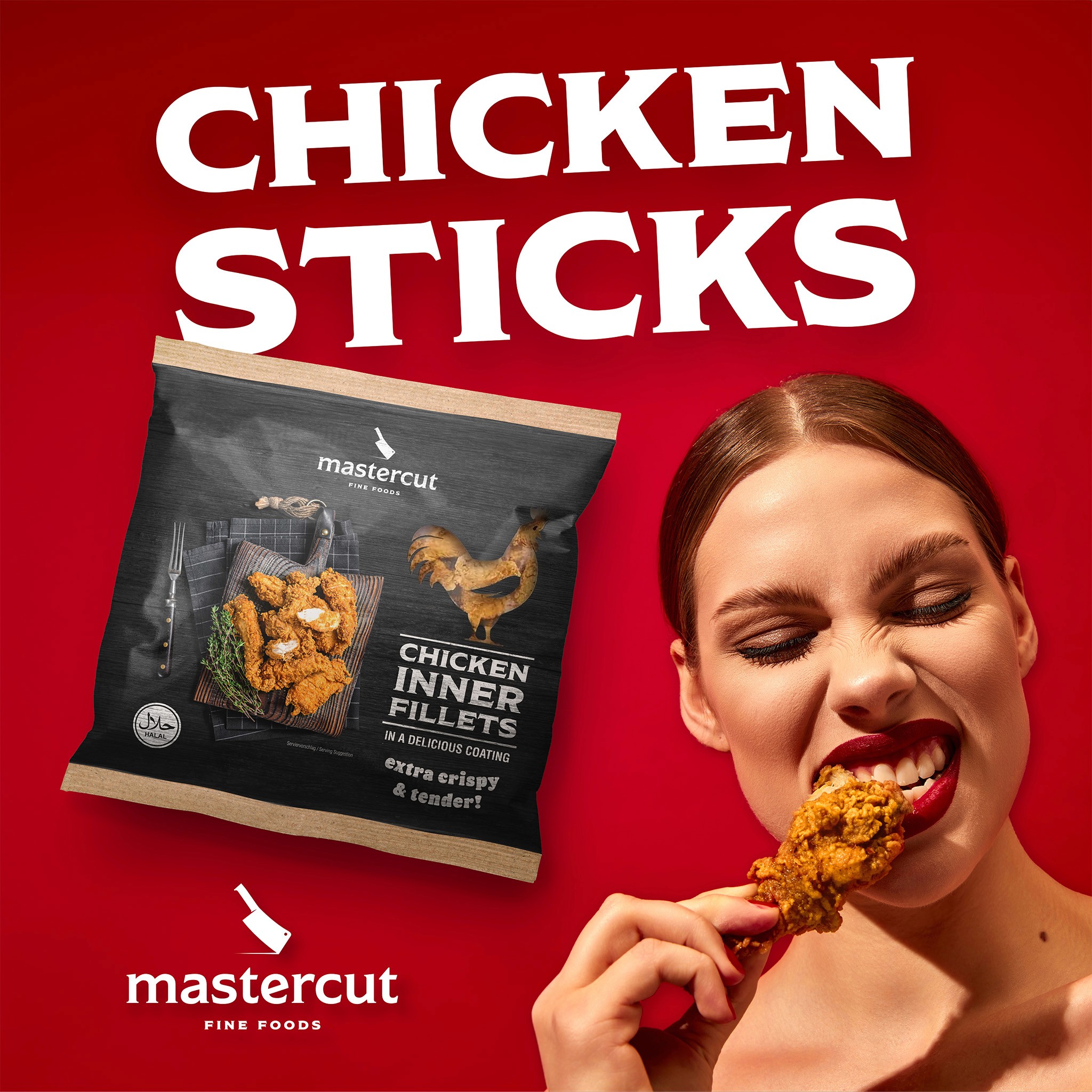 The focus was on elevating product perception through strong visual storytelling. A custom food photoshoot was developed using dark wood textures, classic cutlery, and rustic styling inspired by traditional butchery. Typography was integrated directly into the imagery, while a custom chicken-shaped transparent window was designed to reveal the product inside and reinforce quality and trust.