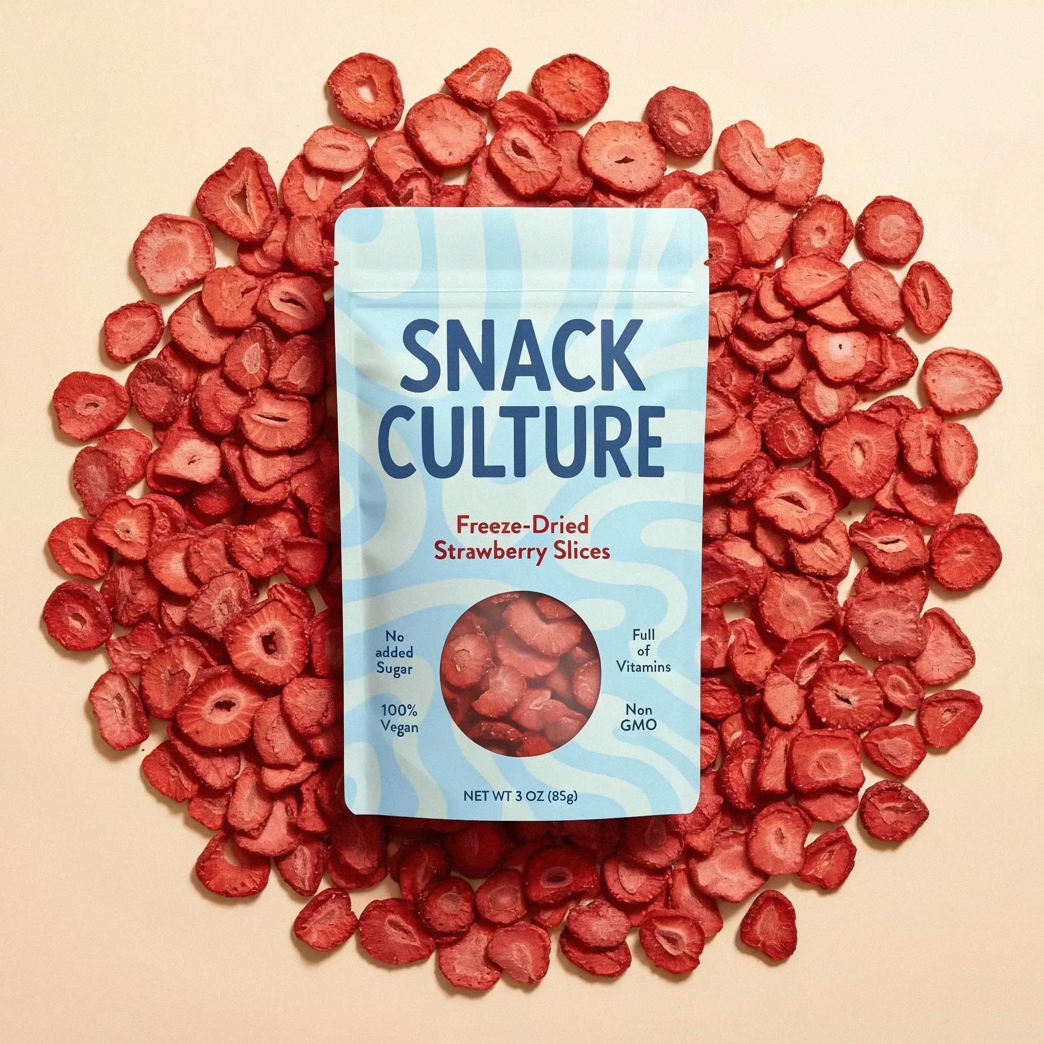 The project centered on developing a bold visual identity and pouch design for freeze-dried strawberry slices - combining a vibrant color palette, fluid graphic patterns, and a transparent window to showcase the product inside. The result is a scalable packaging system designed to attract attention, build brand recognition, and support future product extensions.